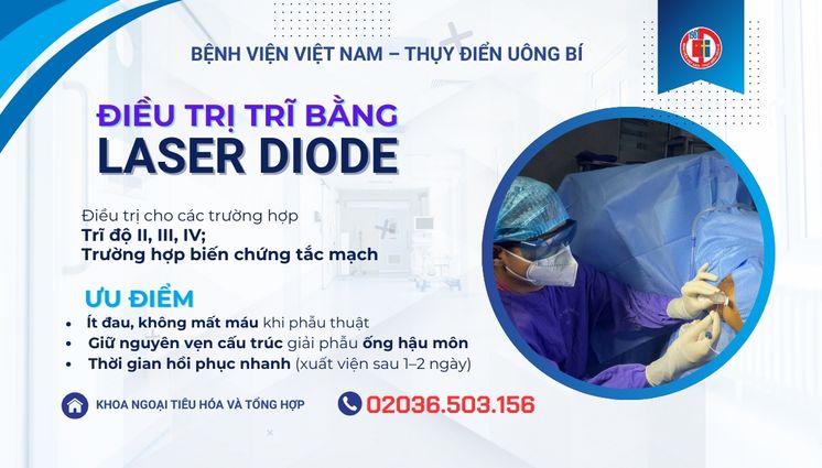 Với kỹ thuật Laser Diode, Khoa Ngoại Tiêu hóa & Tổng hợp - Bệnh viện Việt Nam - Thụy Điển Uông Bí trở thành một trong số ít cơ sở y tế trong nước thực hiện toàn diện các phương pháp điều trị trĩ - từ kinh điển đến hiện đại nhất trên thế giới.
