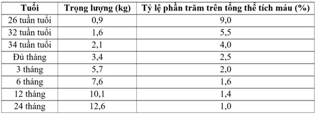 Bảng tỷ lệ 10mL máu trên thể tích máu toàn phần ở trẻ em