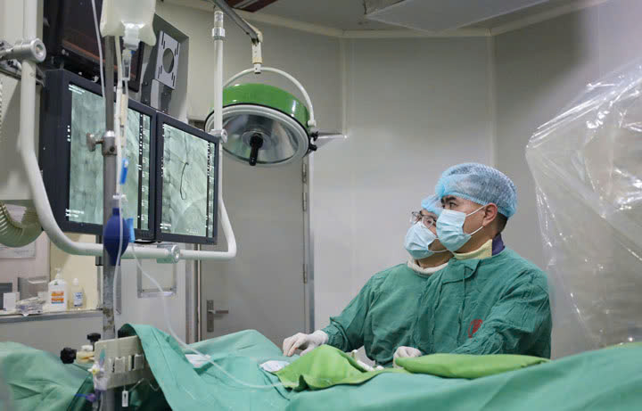 Các bác sĩ tiến hành can thiệp mạch cho người bệnh
