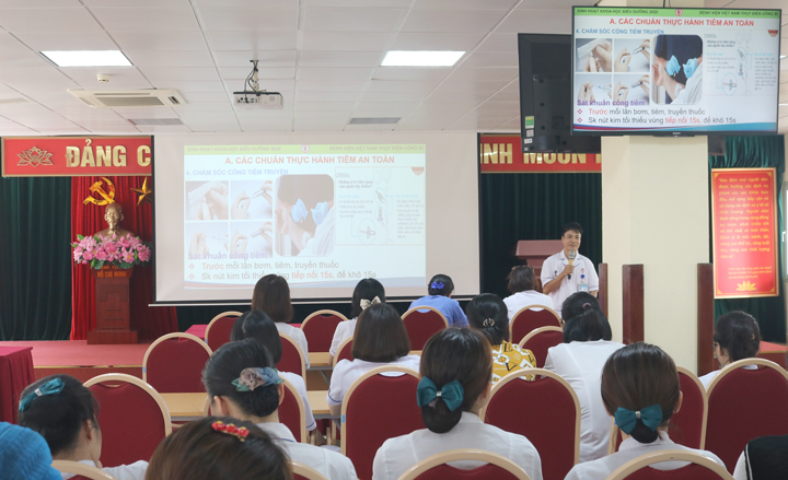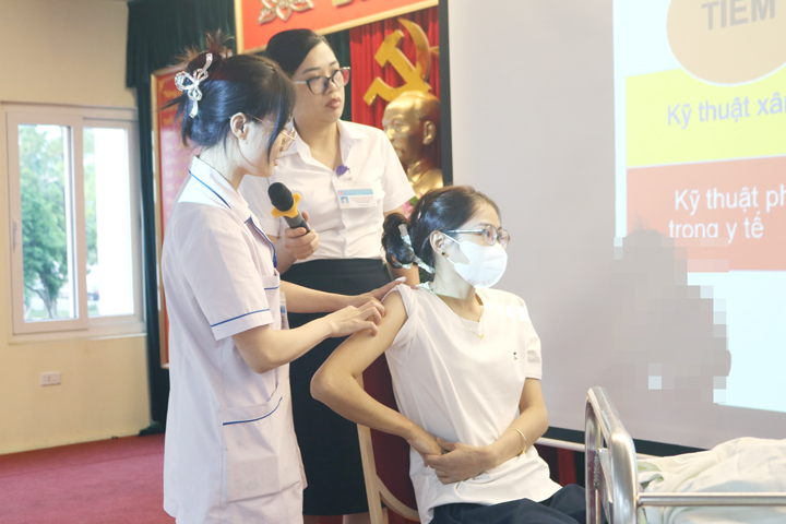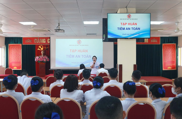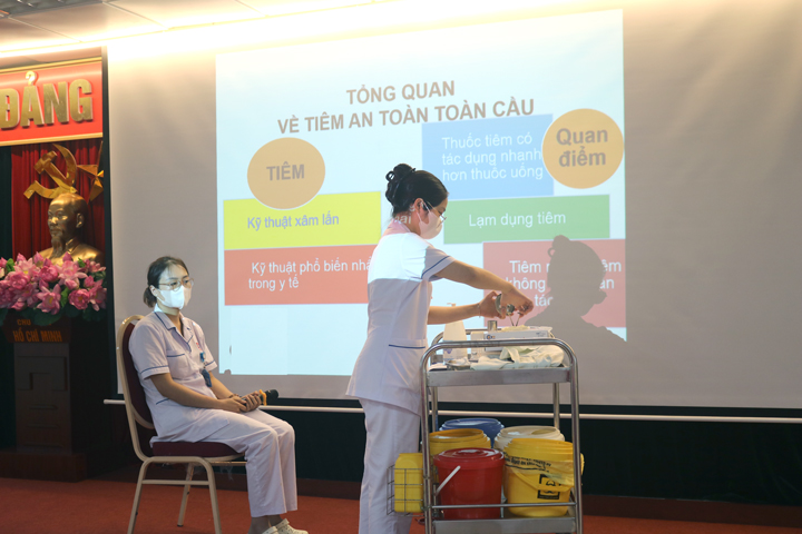 Song song với đó là lớp tập huấn “Tiêm an toàn” dành cho điều dưỡng, hộ sinh, kỹ thuật viên có thời gian công tác dưới 5 năm. Tại đây, nhân viên y tế được củng cố kiến thức về: Nguyên tắc tiêm an toàn, phòng ngừa sự cố y khoa và tai biến trong tiêm truyền; cập nhật những khuyến cáo mới nhất từ WHO và Bộ Y tế. Các học viên cũng được tham gia thực hành quy trình kỹ thuật tiêm, đảm bảo “5 đúng trong tiêm thuốc”: đúng người bệnh – đúng thuốc – đúng liều – đúng đường – đúng thời gian.