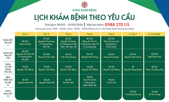 Lịch khám bệnh theo yêu cầu - Khoa Khám bệnh ( 09/5 - 15/3/2026 )