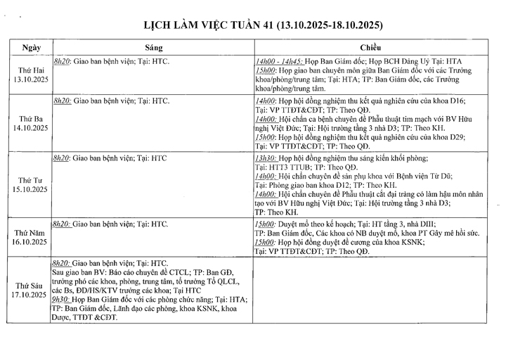 Lịch làm việc tuần 41 ( 13/10 - 18/10/2025 )
