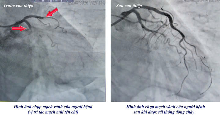 Trước diễn biến nặng, người bệnh được chỉ định chụp mạch vành và can thiệp cấp cứu nhằm tái lập dòng máu nuôi tim. Kết quả chụp mạch cho thấy một tình trạng rất nặng và hiếm gặp: người bệnh bị tắc cấp đồng thời hai nhánh chính động mạch vành. Thông thường, nhồi máu cơ tim cấp chỉ do tắc một nhánh động mạch vành, vì vậy trường hợp này có nguy cơ tử vong rất cao.