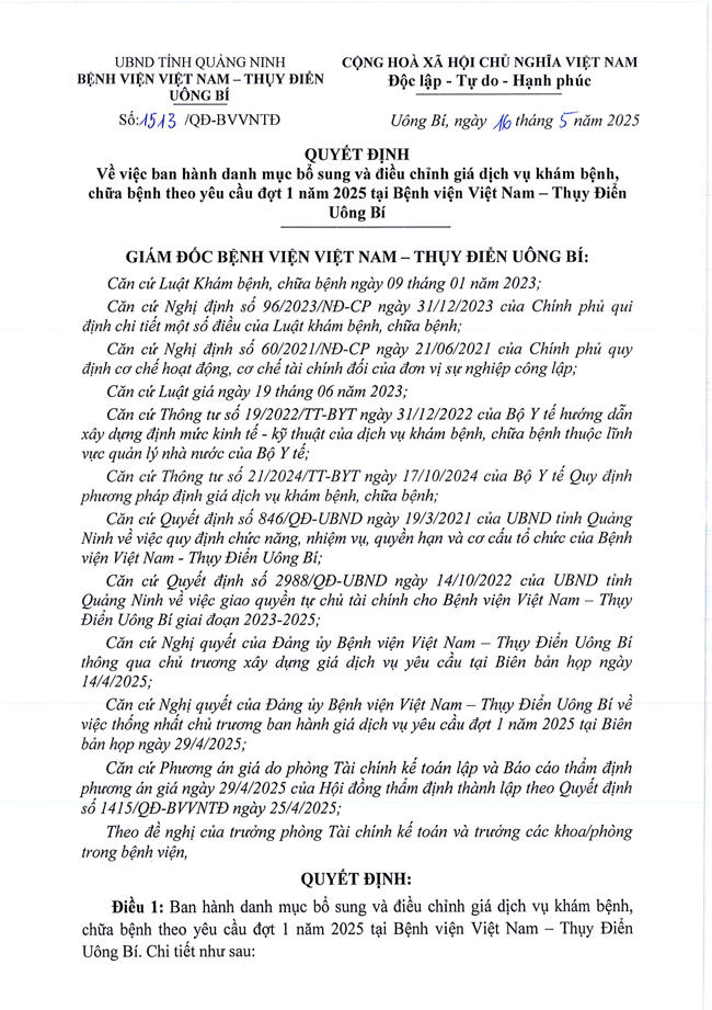 Quyết định số 1513/QĐ-BVVNTĐ v/v ban hành danh mục bổ sung và điều chỉnh giá dịch vụ khám bệnh, chữa bệnh theo yêu cầu đợt 1 năm 2025 tại Bệnh viện Việt Nam - Thụy Điển Uông Bí