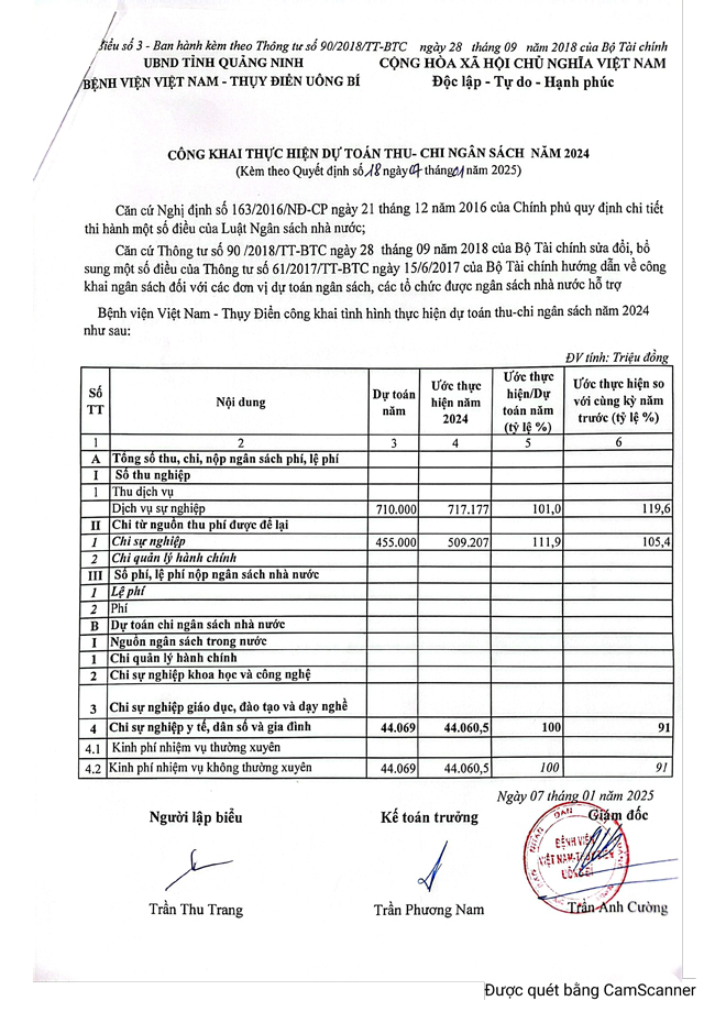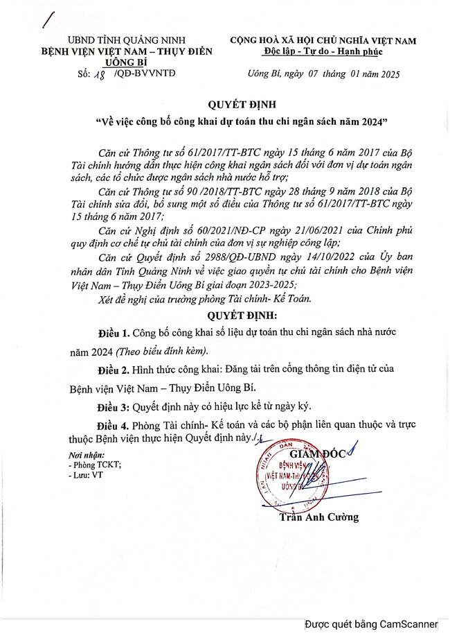 Quyết định số 18/QĐ-BVVNTĐ ngày 07/1/2025 v/v công bố công khai dự toán thu chi ngân sách năm 2024