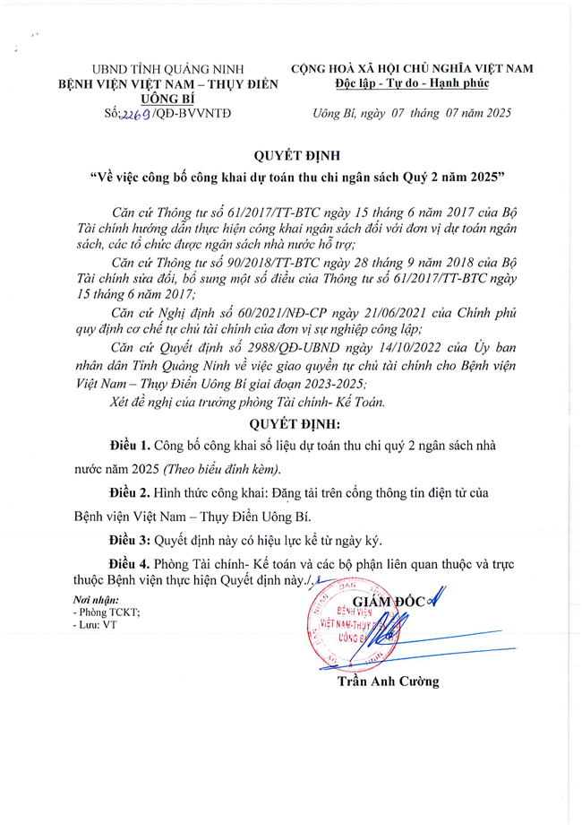 Quyết định số 2269/QĐ-BVVNTĐ v/v công bố công khai dự toán thu chi ngân sách Quý 2 năm 2025