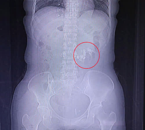 Sỏi thận của người bệnh (Vùng khoanh tròn màu đỏ)