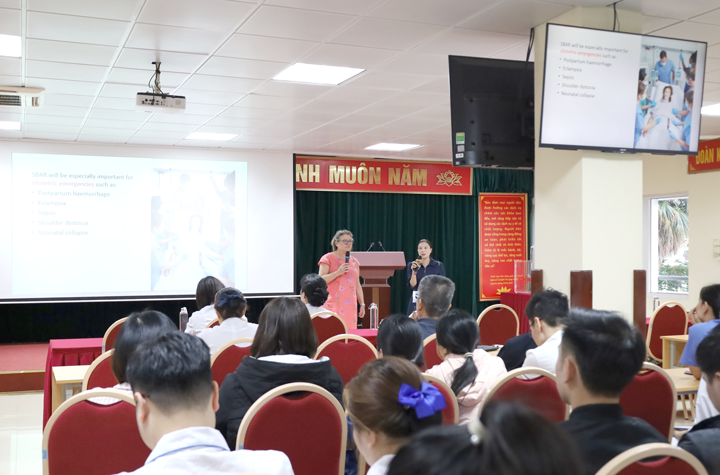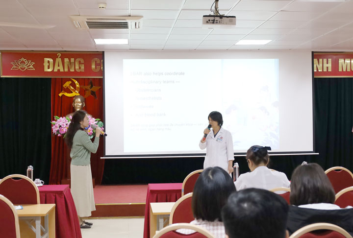 Tại buổi tập huấn, học viên được thực hành nhiều tình huống thực tế, lắng nghe các phân tích chuyên sâu về cách truyền đạt thông tin mạch lạc, trọng tâm và nhất quán giữa bác sĩ và điều dưỡng. Học viên được thảo luận, phân tích ca bệnh, và thực hành SBAR với sự theo dõi, nhận xét và góp ý của giảng viên. Ts. Annette cũng trực tiếp trả lời các câu hỏi chuyên môn được học viên đặt ra trong thời gian diễn ra lớp tập huấn. Qua đây có thể thấy sự tập trung, tinh thần học tập nghiêm túc, cũng như mong muốn nâng cao chất lượng dịch vụ và xây dựng hình ảnh người thầy thuốc tận tâm – chuyên nghiệp – hội nhập quốc tế của các bác sĩ, điều dưỡng Bệnh viện.