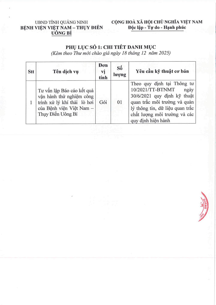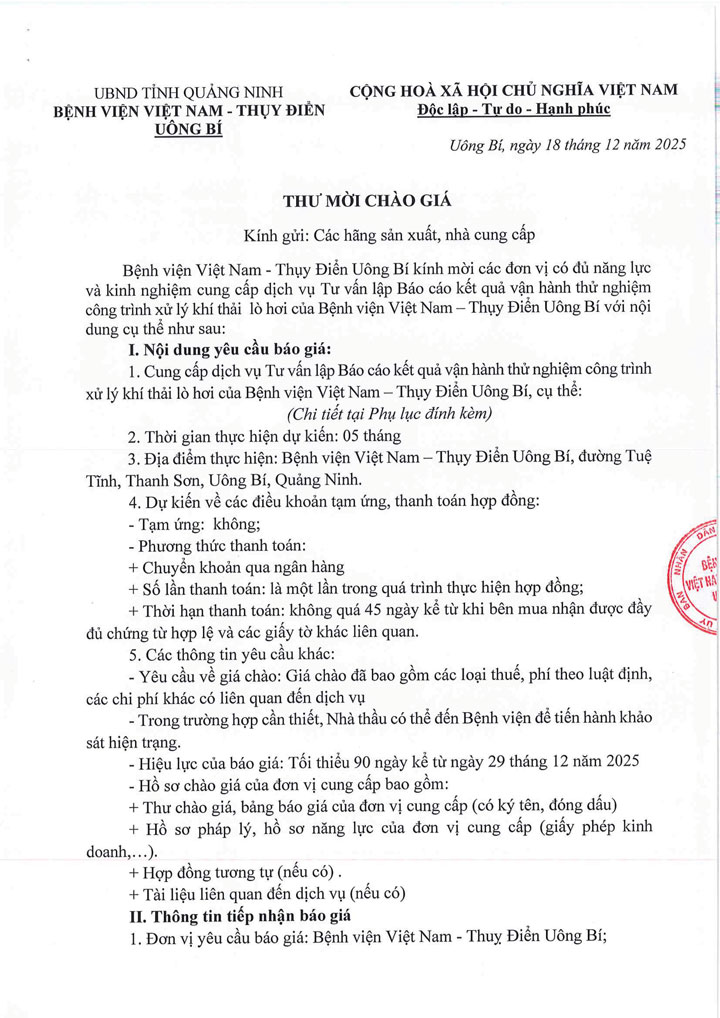 Bệnh viện Việt Nam - Thụy Điển Uông Bí đang có nhu cầu lựa chọn đơn vị cung cấp dịch vụ Tư vấn lập Báo cáo kết quả vận hành thử nghiệm công trình xử lý khí thải lò hơi với nội dung cụ thể như sau:
