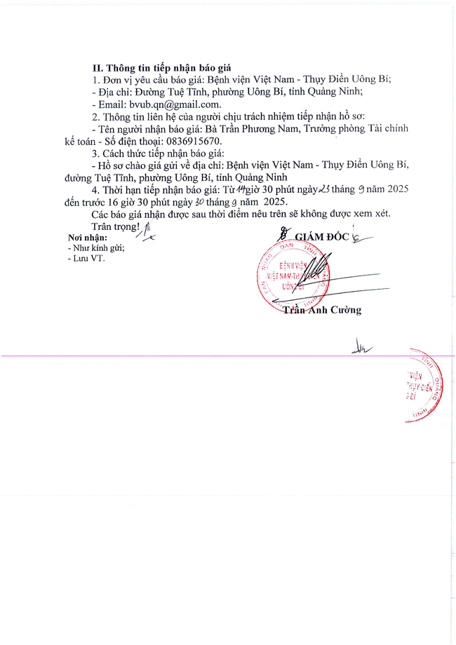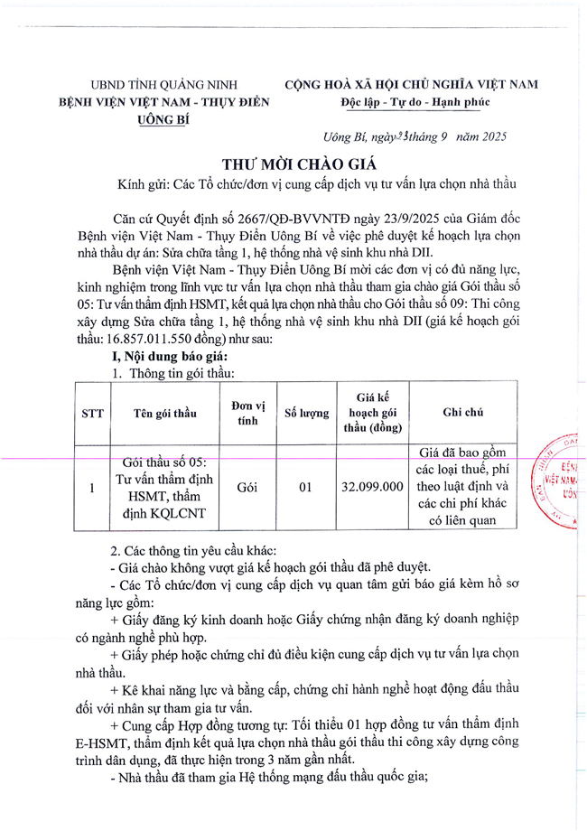 Bệnh viện Việt Nam - Thụy Điển Uông Bí đang có nhu cầu lựa chọn đơn vị tư vấn thẩm định HSMT gói thầu số 5, đánh giá gói thầu số 9 với nội dung cụ thể như sau: