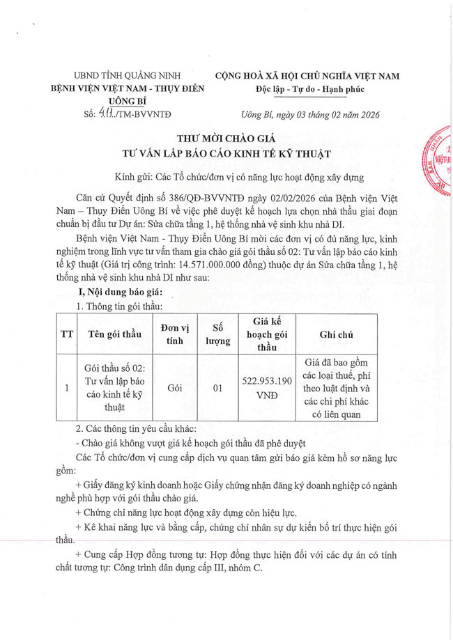 Bệnh viện Việt Nam - Thụy Điển Uông Bí đang có nhu cầu lựa chọn đơn vị tư vấn lập báo cáo kinh tế kỹ thuật với nội dung cụ thể như sau:
