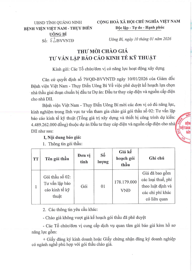 Bệnh viện Việt Nam - Thụy Điển Uông Bí đang có nhu cầu lựa chọn đơn vị tư vấn lập báo cáo kinh tế kỹ thuật gói thầu số 02 với nội dung cụ thể như sau: