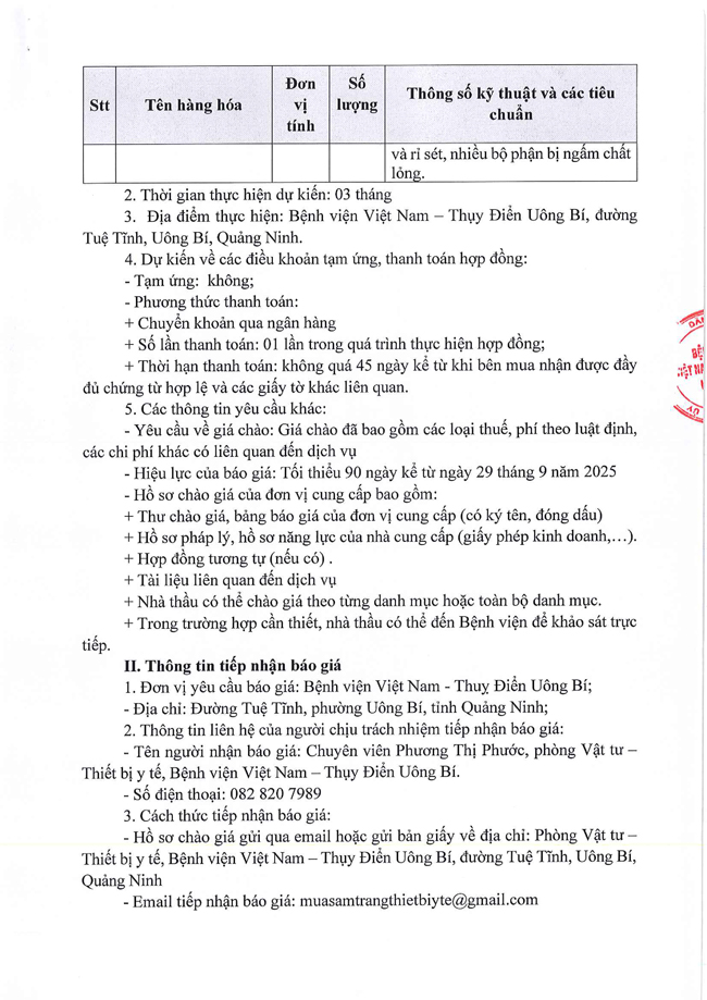 Bệnh viện Việt Nam - Thụy Điển Uông Bí đang có nhu cầu lựa chọn đơn vị cung cấp dịch vụ sửa chữa các dây nội soi cho hệ thống nội soi hãng Olympus năm 2025 với nội dung cụ thể như sau: