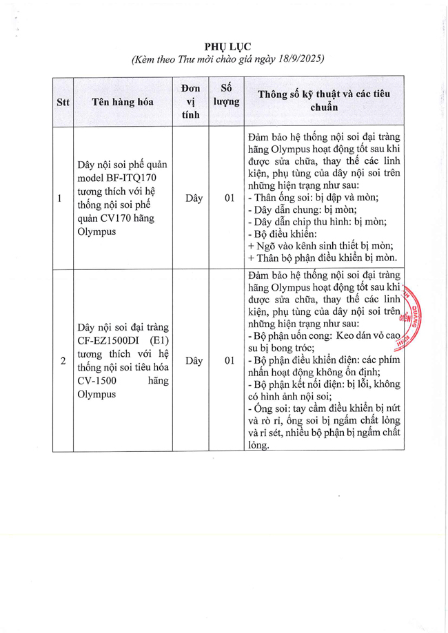 Thư mời chào giá ngày 18/9/2025 đơn vị cung cấp dịch vụ sửa chữa các dây nội soi cho hệ thống nội soi hãng Olympus năm 2025