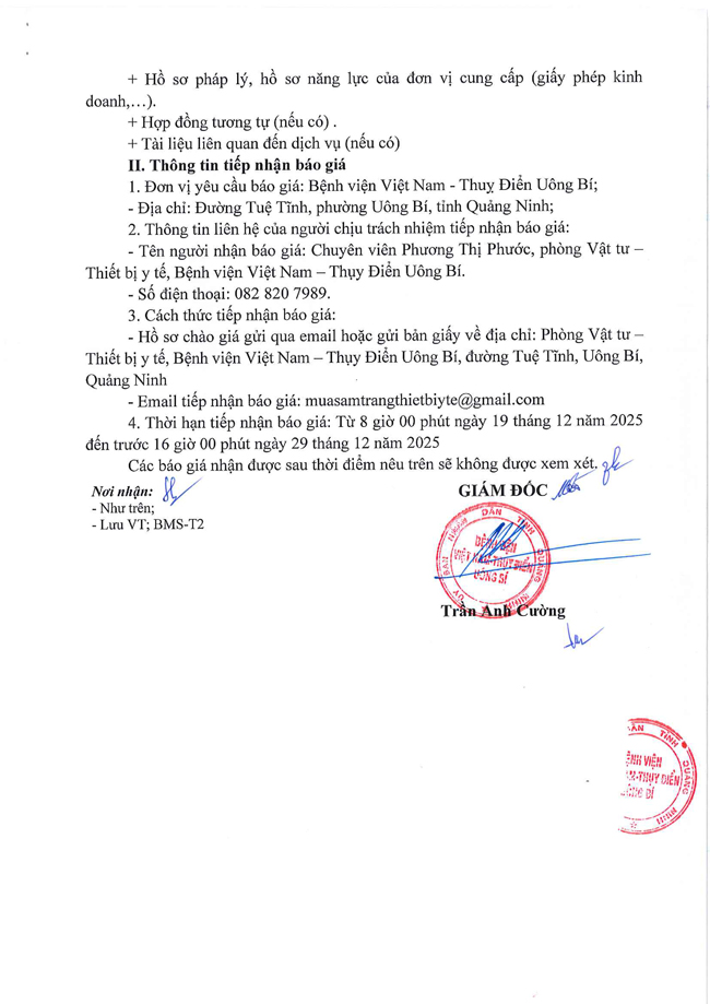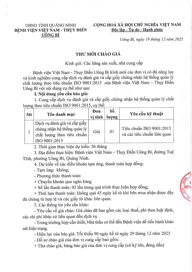Thư mời chào giá ngày 19/12/2025 đơn vị cung cấp dịch vụ đánh giá và cấp giấy chứng nhận hệ thống quản lý chất lượng theo tiêu chuẩn ISO 9001:2015