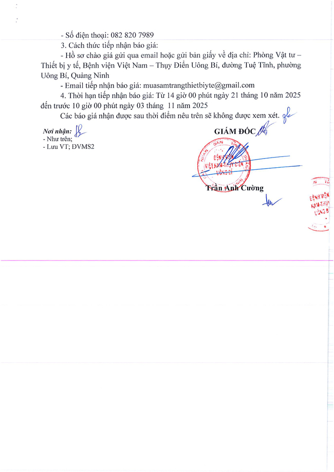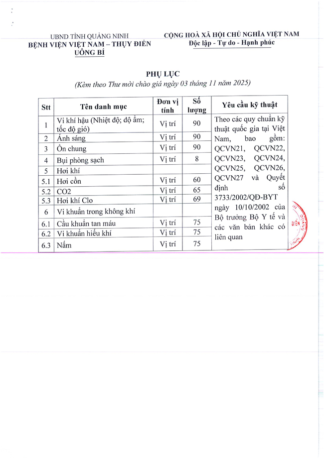 Bệnh viện Việt Nam - Thụy Điển Uông Bí đang có nhu cầu lựa chọn đơn vị cung cấp dịch vụ đo kiểm, quan trắc môi trường lao động năm 2025 với nội dung cụ thể như sau: