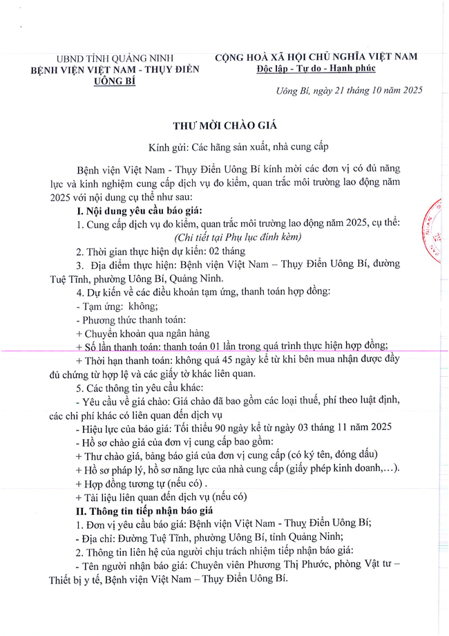 Thư mời chào giá ngày 21/10/2025 đơn vị cung cấp dịch vụ đo kiểm, quan trắc môi trường lao động năm 2025