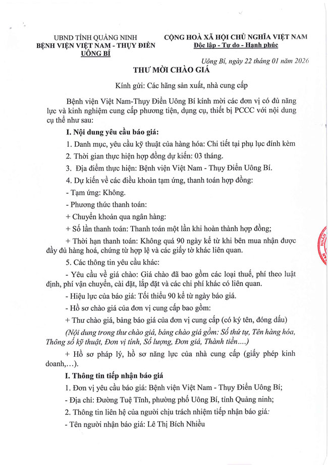 Bệnh viện Việt Nam - Thụy Điển Uông Bí đang có nhu cầu lựa chọn đơn vị cung cấp phương tiện, dụng cụ, thiết bị PCCC với nội dung cụ thể như sau: