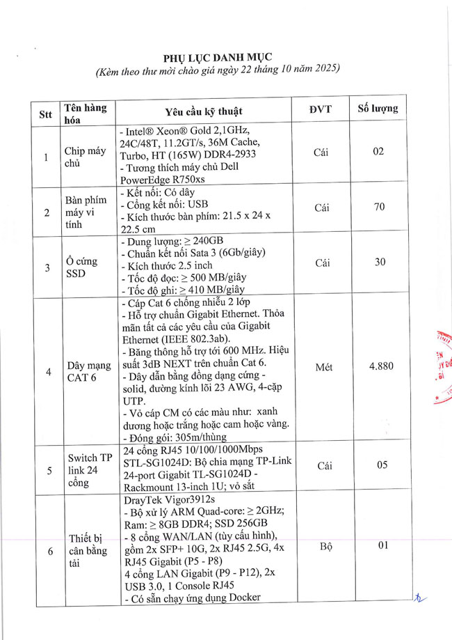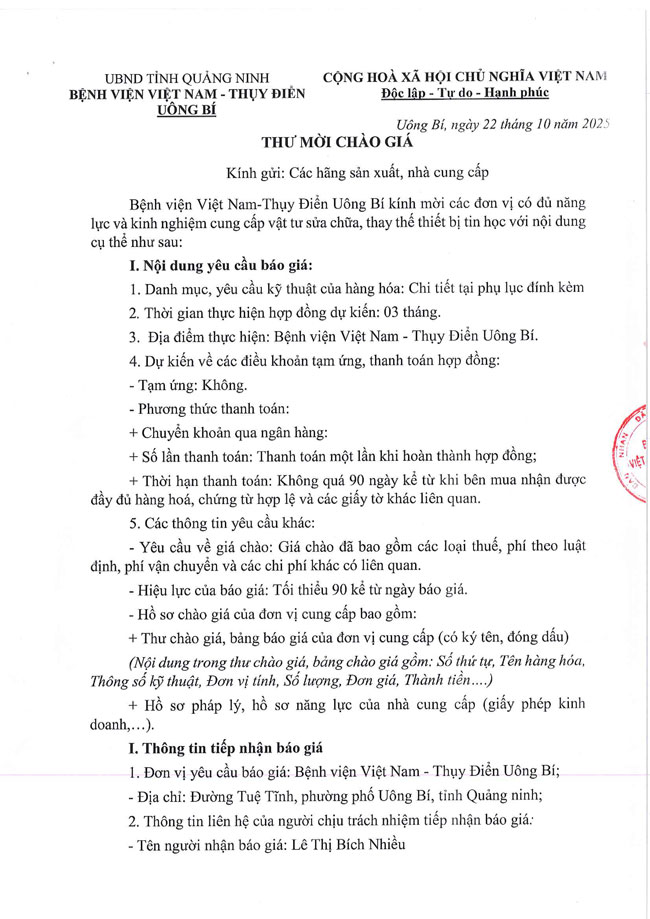 Thư mời chào giá ngày 22/10/2025 đơn vị cung cấp vật tư sửa chữa, thay thế thiết bị tin học
