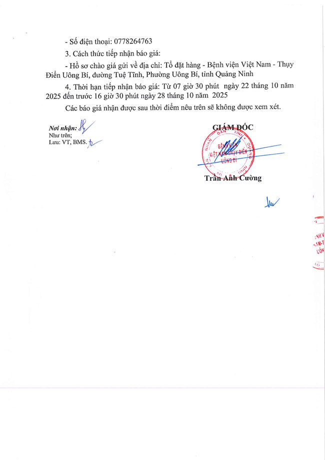Bệnh viện Việt Nam - Thụy Điển Uông Bí tích cực trong chuyển đổi số y tế và chăm sóc người bệnh(9 lượt xem)Giúp người phụ nữ thoát khỏi khối u mỡ khổng lồ ở lưng(63 lượt xem)Bị thủng dạ dày do mảnh cành cây(40 lượt xem)Lịch khám yêu cầu khoa Khám bệnh ( 10/11- 15/11/2025 )(4 lượt xem)Hai lần đột quỵ – Hai lần hồi sinh nhờ đến viện kịp thời!(53 lượt xem)Người phụ nữ bị bỏng kết giác mạc do dung dịch ủ chấy(75 lượt xem)Thư mời chào giá ngày 03/11 gói thầu số 08: Bảo hiểm công trình(40 lượt xem)Lịch khám bệnh theo yêu cầu - Khoa Khám bệnh ( 03/11 - 8/11/2025 )(48 lượt xem)Trung tâm Kiểm chuẩn chất lượng xét nghiệm Y học – Đại học Y Hà Nội đánh giá chất lượng phòng xét nghiệm tại Bệnh viện Việt Nam – Thụy Điển Uông Bí(79 lượt xem)Vảy nến có thể kiểm soát được khi người bệnh được điều trị đúng, sớm và đủ(71 lượt xem)Cảnh báo chấn thương từ vật nuôi trong nhà(72 lượt xem)Tự pha nước muối nhỏ mắt, người đàn ông phải nhập viện(104 lượt xem)Bệnh nhi nuốt móc khóa vào bụng, được bác sĩ kịp thời gắp ra an toàn(108 lượt xem)Lịch khám bệnh theo yêu cầu - Khoa Khám bệnh ( 27/10 - 01/11/2025 )(70 lượt xem)Thư mời chào giá ngày 27/10/2025 đơn vị kiểm toán độc lập dự án Sửa chữa tầng 1, hệ thống nhà vệ sinh khu nhà DII(61 lượt xem)Hiệu quả của điều trị phục hồi chức năng trên người bệnh gãy xương sườn(87 lượt xem)Người phụ nữ bị nhiễm trùng sau khi cấy chỉ tại cơ sở không uy tín(71 lượt xem)Báo động đỏ toàn viện, cứu sống ca bệnh với vết thương phức tạp vùng cổ(100 lượt xem)Thư mời chào giá ngày 22/10/2025 gói thầu Tư vấn giám sát thi công xây dựng(128 lượt xem)Thư mời chào giá ngày 21/10/2025 đơn vị cung cấp dịch vụ đo kiểm, quan trắc môi trường lao động năm 2025(226 lượt xem)Người đàn ông bị bỏng nặng do đốt rác bằng xăng(112 lượt xem)Hưởng ứng ngày loãng xương thế giới 20/10: Chăm sóc xương khớp – Trao gửi yêu thương cho phụ nữ(111 lượt xem)Lịch khám bệnh theo yêu cầu - Khoa Khám bệnh ( 20/10 - 25/10/2025 )(82 lượt xem)“Nhặt được của rơi, trả người bị mất” - Lan tỏa những hành động đẹp(131 lượt xem)Cảnh báo nguy cơ từ việc tự ý dùng thuốc(115 lượt xem)Khối u lớn vùng khuỷu tay do hạt tophy gout(110 lượt xem)Yêu cầu báo giá ngày 15/10/2025 gói thầu Mua sắm dịch vụ sửa chữa máy siêu âm tổng quát Hitachi F37 và máy X-quang di động GE XR240 năm 2025(46 lượt xem)