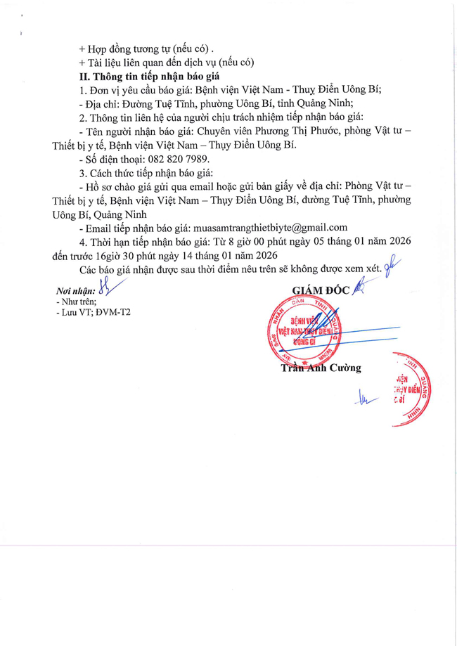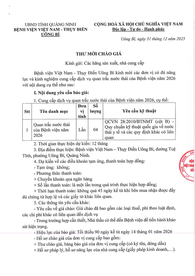 Thư mời chào giá ngày 31/12/2025 đơn vị cung cấp dịch vụ quan trắc nước thải của Bệnh viện