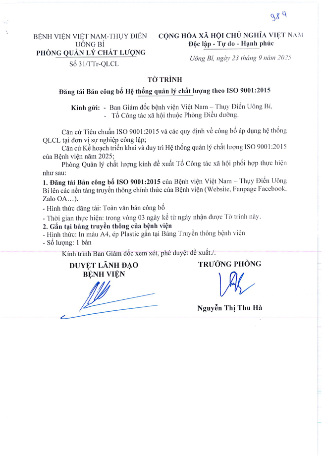 Tờ trình số 31/TTr-QLCL v/v đăng tải Bản công bố Hệ thống quản lý chất lượng theo ISO 9001:2015
