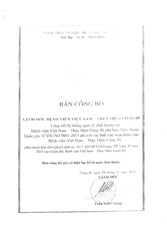Nghị quyết số 72-NQ/TW của Bộ Chính trị về một số giải pháp đột phá, tăng cường bảo vệ, chăm sóc và nâng cao sức khỏe Nhân dân(455 lượt xem)Quyết định số 2301/QĐ-BVVNTĐ ngày 07/7/2025 v/v công bố công khai dự toán thu chi ngân sách 6 tháng đầu năm 2025(134 lượt xem)Quyết định số 2269/QĐ-BVVNTĐ v/v công bố công khai dự toán thu chi ngân sách Quý 2 năm 2025(145 lượt xem)Quyết định số 1236/QĐ-BVVNTĐ v/v công bố công khai dự toán thu chi ngân sách Quý 1 năm 2025(129 lượt xem)Quyết định số 49/QĐ-SYT-TTHC v/v điều chỉnh giầy phép hoạt động do thay đổi quy mô hoạt động và phê duyệt bổ sung danh mục kỹ thuật chuyên môn trong khám, chữa bệnh tại Bệnh viện Việt Nam - Thụy Điển Uông Bí(220 lượt xem)Quyết định số 51/QĐ-TTMS ngày 11/02/2025 v/v phê duyệt kêt quả lựa chọn nhà thầu Gói thầu số 01: Cung cấp thuốc cho các tỉnh miền Bắc giai đoạn 2024-2026 đợt 2 (Mã hiệu ĐTTT.01.2024.2)(1.494 lượt xem)Quyết định số 428/QĐ-BVVNTĐ ngày 06/02/2025 v/v phê duyệt kết quả lựa chọn nhà thầu Gói thầu thuốc generic thuộc dự toán cung cấp thuốc cho Bệnh viện Việt Nam - Thụy Điển Uông Bí năm 2024(794 lượt xem)Quyết định số 451/QĐ-UBND phê duyệt đề án phát triển Bệnh viện Việt Nam - Thụy Điển Uông Bí giai đoạn 2025-2030, định hướng đến năm 2035(413 lượt xem)Quyết định số 68/QĐ-BVVNTĐ v/v phê duyệt kết quả lựa chọn nhà thầu Gói thầu thuốc biệt dược gốc thuộc dự toán cung cấp thuốc cho Bệnh viện Việt Nam - Thụy Điển Uông Bí năm 2024(446 lượt xem)Danh sách người thực hành đã hoàn thành quá trình thực hành khám bệnh, chữa bệnh ngày 15/01/2025(690 lượt xem)Báo cáo số 151/BC-BVVNTĐ về việc tự kiểm tra, đánh giá chất lượng bệnh viện năm 2024(554 lượt xem)Quyết định số 96/QĐ-TTMS v/v phê duyệt kết quả lựa chọn nhà thầu lần 2 Gói thầu số 01: Cung cấp thuốc cho các tỉnh miền Bắc giai đoạn 2024-2026 đợt 1 ( Mã hiệu ĐTTT.01.2024.1)(1.036 lượt xem)Quyết định số 361/QĐ-SYT-TTHC về việc xếp cấp chuyên môn kỹ thuật cơ sở khám bệnh, chữa bệnh(804 lượt xem)Quyết định số 19/QĐ-BVVNTĐ ngày 07/1/2025 v/v công bố công khai dự toán thu ngân sách quý 4 năm 2024(85 lượt xem)Quyết định số 18/QĐ-BVVNTĐ ngày 07/1/2025 v/v công bố công khai dự toán thu chi ngân sách năm 2024(83 lượt xem)Danh sách người thực hành đã hoàn thành quá trình thực hành khám bệnh, chữa bệnh ngày 31/12/2024(439 lượt xem)Quyết định số 86/QĐ-TTMS v/v phê duyệt kết quả lựa chọn nhà thầu lần 1 Gói thầu số 01: Cung cấp thuốc cho các tỉnh miền Bắc giai đoạn 2024-2026 đợt 1 ( Mã hiệu: ĐTTT.01.2024.1)(898 lượt xem)Công văn số 3671/BVVNTĐ-TTĐT&CĐT ngày 12/12/2024 v/v báo cáo danh sách người thực hành khám bệnh, chữa bệnh tại bệnh viện(360 lượt xem)Quyết định số 3614/QĐ-BYT v/v công bố thủ tục hành chính được sửa đổi, bổ sung trong lĩnh vực Y tế dự phòng quy định tại Thông tư số 20/2024/TT-BYT ngày 14 tháng 10 năm 2024 của Bộ trưởng Bộ Y tế thuộc lĩnh vực quản lý của Bộ Y tế(556 lượt xem)Quyết định số 3562/QĐ-BYT công bố thủ tục hành chính thuộc lĩnh vực Y, Dược cổ truyền được quy định tại Thông tư số 24/2024/TT-BYT(839 lượt xem)Quyết định số 3514/QĐ-BYT v/v bãi bỏ QĐ 5086/QĐ-BYT và QĐ 2807/QĐ-BYT(3.051 lượt xem)Quyết định phê duyệt kết quả lựa chọn nhà thầu gói thầu thuộc dự toán chương trình huấn luyện ATVSLĐ năm 2024(406 lượt xem)Quyết định phê duyệt kế hoạch lựa chọn nhà thầu gói thầu thuộc dự toán chương trình huấn luyện an toàn vệ sinh lao động năm 2024(456 lượt xem)Công văn số 3141/BVVNTĐ-TTĐT&CĐT ngày 28/10/2024 v/v báo cáo danh sách người thực hành khám bệnh, chữa bệnh tại bệnh viện(210 lượt xem)Quyết định số 2903/QĐ-BVVNTĐ ngày 10/10/2024 về việc công bố công khai dự toán thu chi ngân sách Quý 3 năm 2024(417 lượt xem)Công văn số 2747/BVVNTĐ-TTĐT&CĐT ngày 27/09/2024 v/v báo cáo danh sách người thực hành khám bệnh, chữa bệnh tại bệnh viện(226 lượt xem)Công văn số 2618/BVVNTĐ-TTĐT&CĐT ngày 12/09/2024 v/v báo cáo danh sách người thực hành khám bệnh, chữa bệnh tại bệnh viện(209 lượt xem)Dự án nâng cao chất lượng Internet Bệnh viện năm 2024 - 2025(311 lượt xem)Thông báo về việc thực hiện chính sách thu hút bác sĩ về làm việc tại Bệnh viện theo Nghị quyết số 28/2023/NQ-HĐND của HĐND tỉnh Quảng Ninh(784 lượt xem)Công văn số 2263/BVVNTĐ-TTĐT&CĐT ngày 12/08/2024 v/v báo cáo danh sách người thực hành khám bệnh, chữa bệnh tại bệnh viện(215 lượt xem)Quyết định số 897/QĐ-SYT ngày 12/07/2024 v/v phê duyệt kết quả lựa chọn nhà thầu Gói thầu thuốc dược liệu, thuốc có thành phần dược liệu phối hợp với dược chất hóa dược, thuốc cổ truyền (191 lượt xem)Công văn số 2193/BVVNTĐ ngày 09/8/2024 v/v báo cáo công khai tình hình thực hiện dự toán ngân sách nhà nước năm 2023 và công khai dự toán ngân sách năm 2024(77 lượt xem)Công văn số 1961/BVVNTĐ-TTĐT&CĐT ngày 15/07/2024 v/v báo cáo danh sách người thực hành khám bệnh, chữa bệnh tại bệnh vi